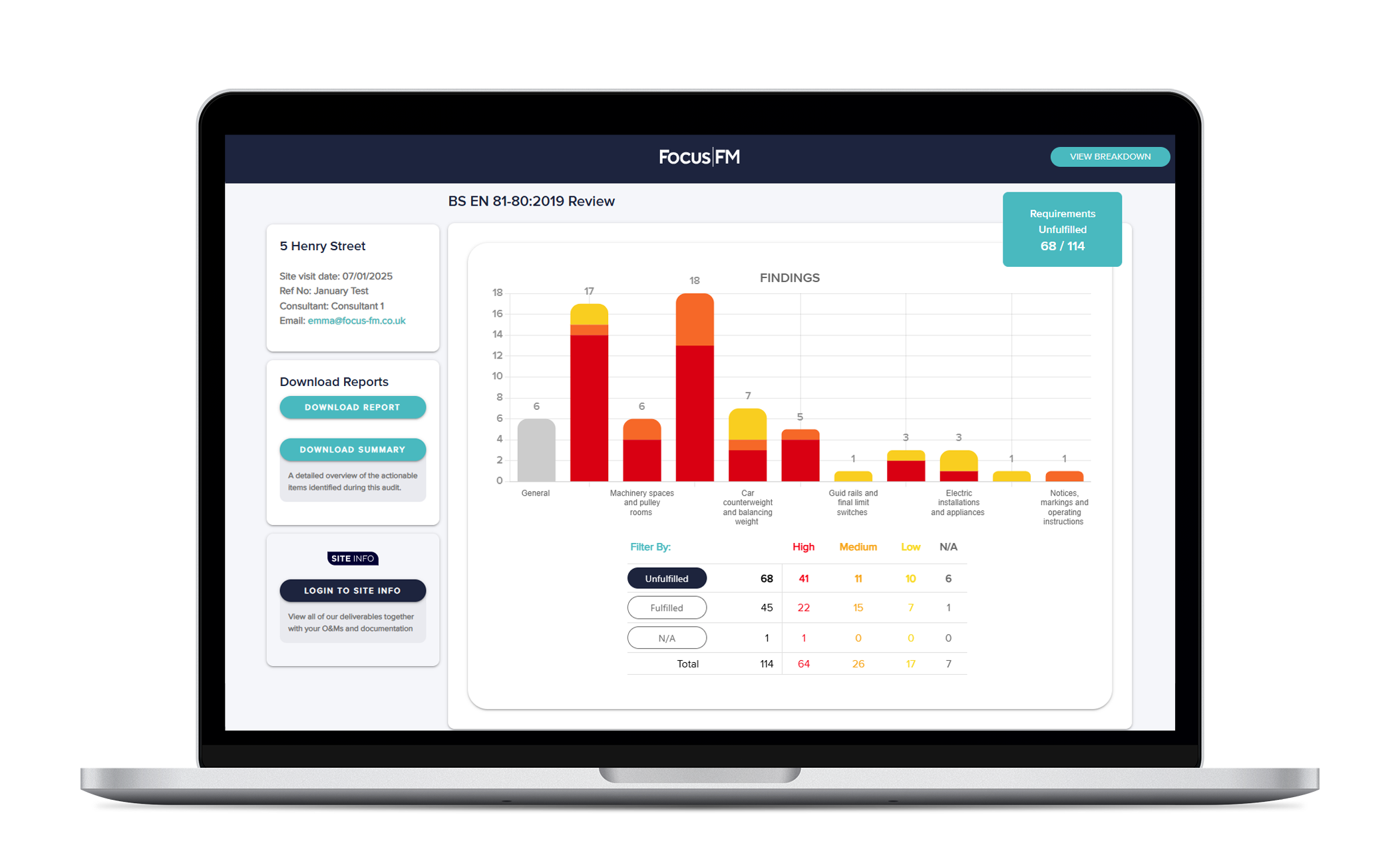 Using EMMA, our new BS EN 81-80:2019 identifies all low, medium, and high-risk items, helping you to understand the safety and compliance of your lifts.